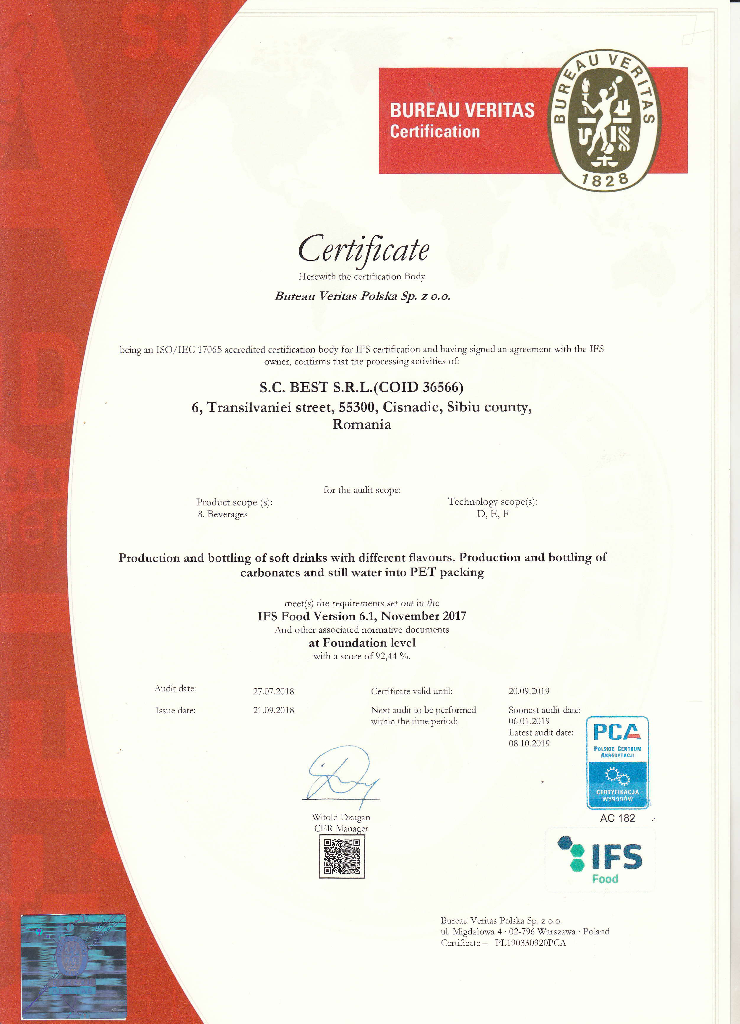 Compania Best S.R.L. este certificată în sistemul de management al alimentelor IFS de către BUREAU VERITAS. Certificat